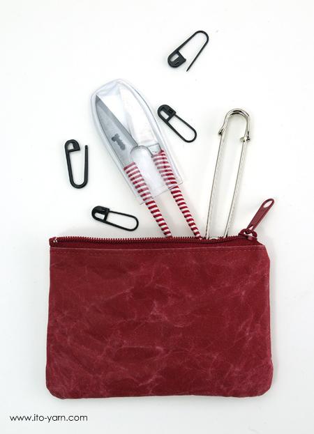 Small useful zipper cases for stitch markers, scissors, cable needles and other notions. The inside is divided into two compartments for separating notions.